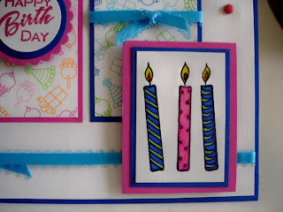 I love the colors, love this Doodlebug Design pattern paper, and the sketch. Candle image is part of the Candle stamp by Northwoods Rubber Stamps. In the original image there are 9 Candles. I colored only 3 them with markers and layered them with cardstock.