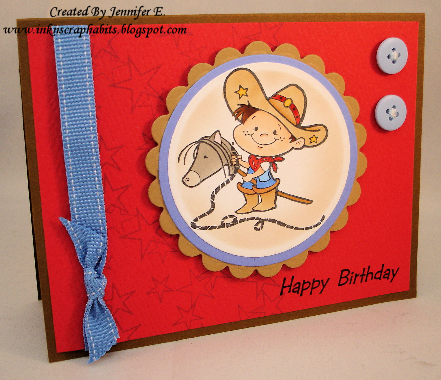 I started first by coloring the image with Copic Markers and then I sponged light brown ink around it while it was in a circle Nestability die. I layered it as shown and next I decorated the red cardstock for my card front. I stamped the Interlocking Star Background (819H) on the left hand side with blue ink and I used one of the greetings from the Birthday Multi Greeting (219P) for the sentiment. I adhered the image in the center of the card front using foam tape. I added some ribbon to the far left side and a couple buttons on the upper right side. Finally, I adhered the card front to an A2 brown cardstock base. Cute and fun, wouldn't you say?
