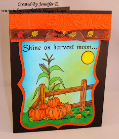 I started with white cardstock that was cut with the Top Note die. All of the coloring on the Fall Fence (176M) was done with Copic Markers. Then I sponged yellow ink for the area where the moon was shining down and the edges were inked with a darker blue ink to accent the evening sky. I then added the Shine On sentiment (470D) above the image. I matted the colored image with orange cardstock and added a leaf embossed orange panel to the top. It was wrapped and tied with Fall themed ribbon and it was all adhered to a dark brown cardstock base.